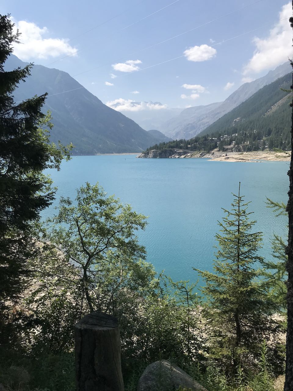 Nous rallions Ceresole Reale centre bourg et nous nous engageons pour faire le tour de ce grand lac artificiel. Des 1920 les hommes ont implanté ici un vaste barrage. La retenue d’eau de plus de 3 kms de long et de 400 de large alimente une turbine qui produit de l’électricité.